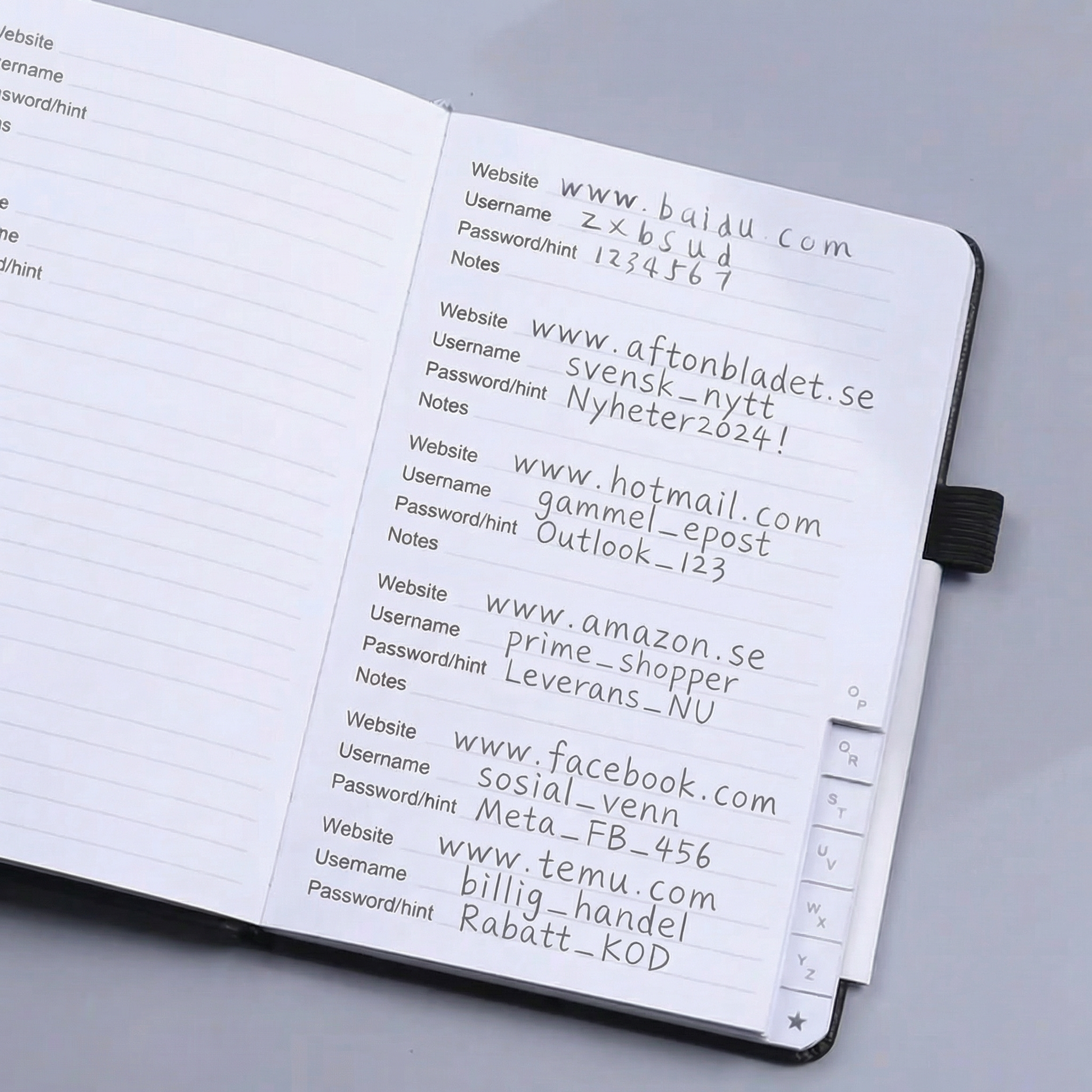 Skeptisk först. Tänkte att det kanske var osäkert att skriva ner lösenord. Men min son förklarade att hackare är på nätet, inte i mitt hem. Boken ligger i min byrålåda bakom strumporna. Mycket säkrare än att ha lösenord i telefonen som jag glömmer låskoden till hela tiden.